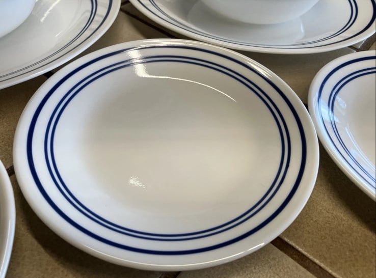 Classic design of triple blue bands in a cafe’ style look on white background. The color is inspired by vintage metal enamelware, white with blue edges.