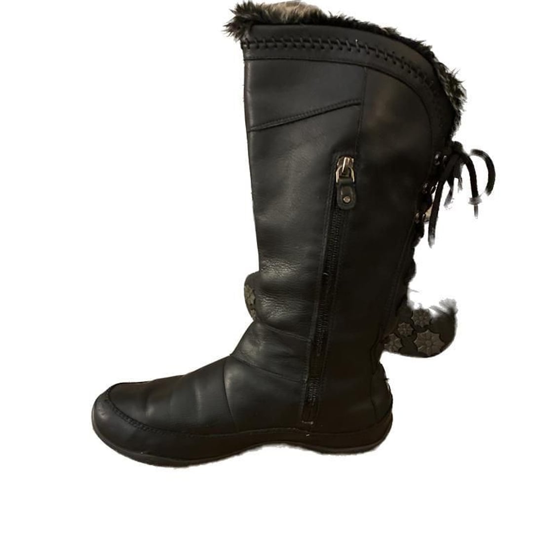 The North Face Janey II Luxe insulated, waterproof boots. They are tall, black leather winter boots with a faux fur trim collar and a lace-up detail at the back.