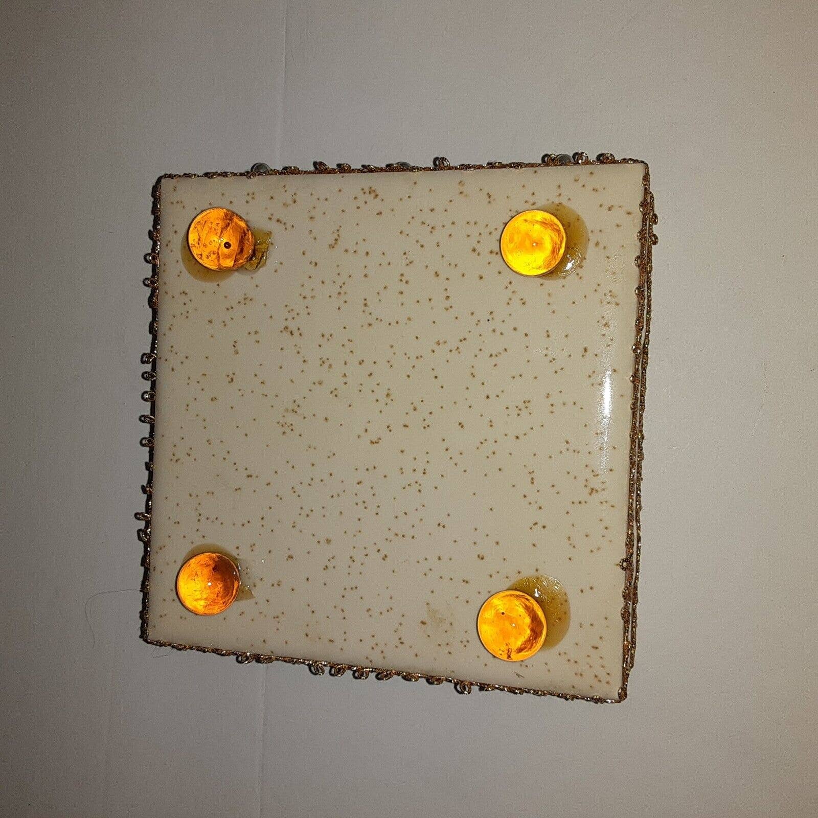 Vintage Handcrafted Budoir/Vanity Matchstick holder w/Pearl seed push pin drawer pulls & Gold trim on Tile.Amber like ball feet beads. I'm guessing 1940s-1950's by the look of the tiles.If anyone knows please let me know. Approximately: 5x5x2